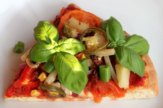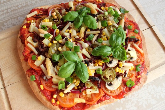 Derefter er det op til fantasien, hvad man vil dække sin pizza med. På billedet har jeg brugt skiveskårne tomater, champignoner, rødløg, majs, ananas, asparges fra dåse, jalapenos og soltørrede tomater. Basilikum og forårsløg efter pizzaen har været i ovnen.