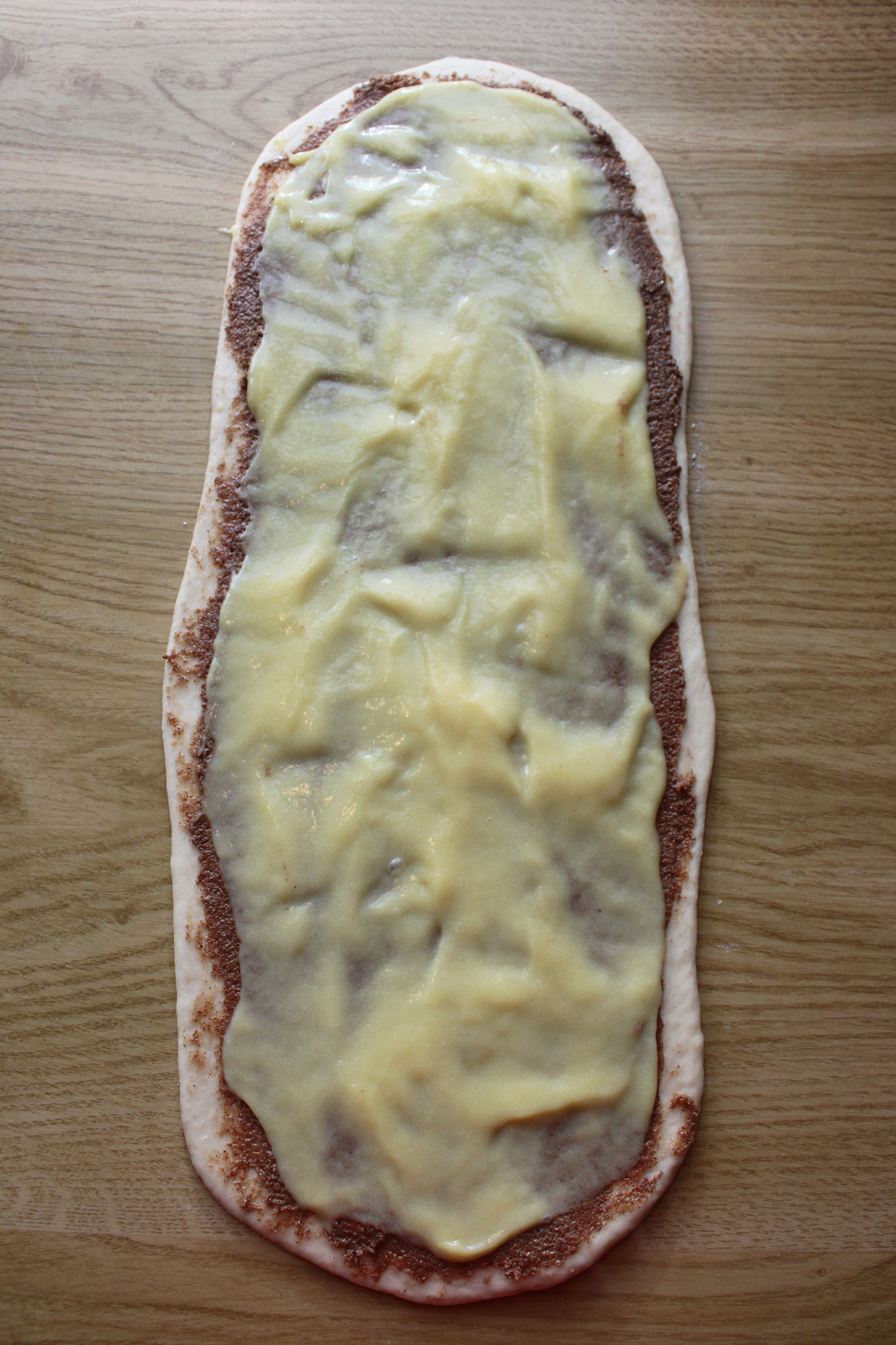 Når dejen er færdig med at hæve, æltes den og deles i tre lige store klumper (brug evt. en vægt, så klumperne vejer det samme). Hver klump æltes igen og rulles tyndt ud som en aflang firkant, der har samme længde som bagepladen. Dejen smøres først med kanelblandingen og derefter med kagecremen.