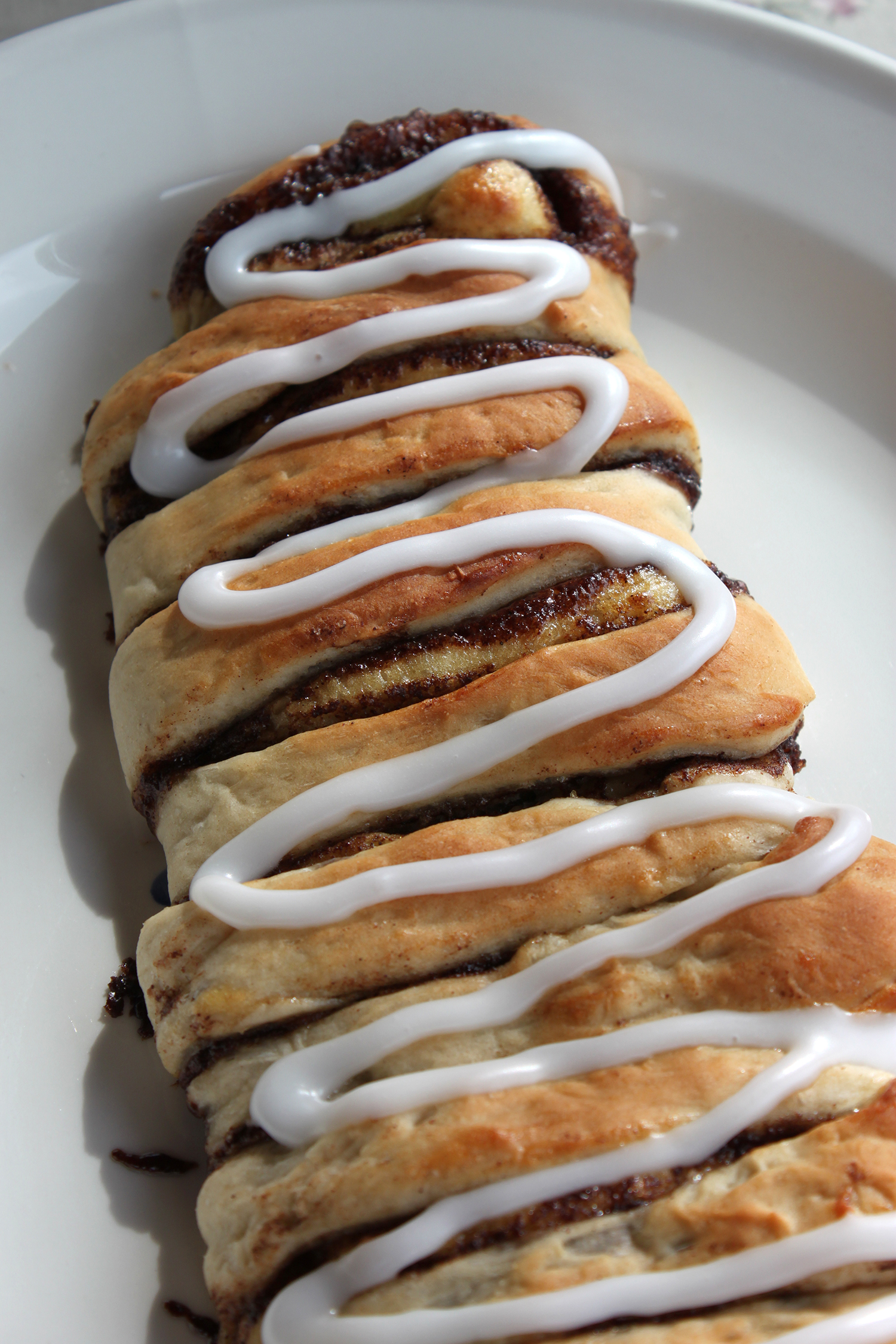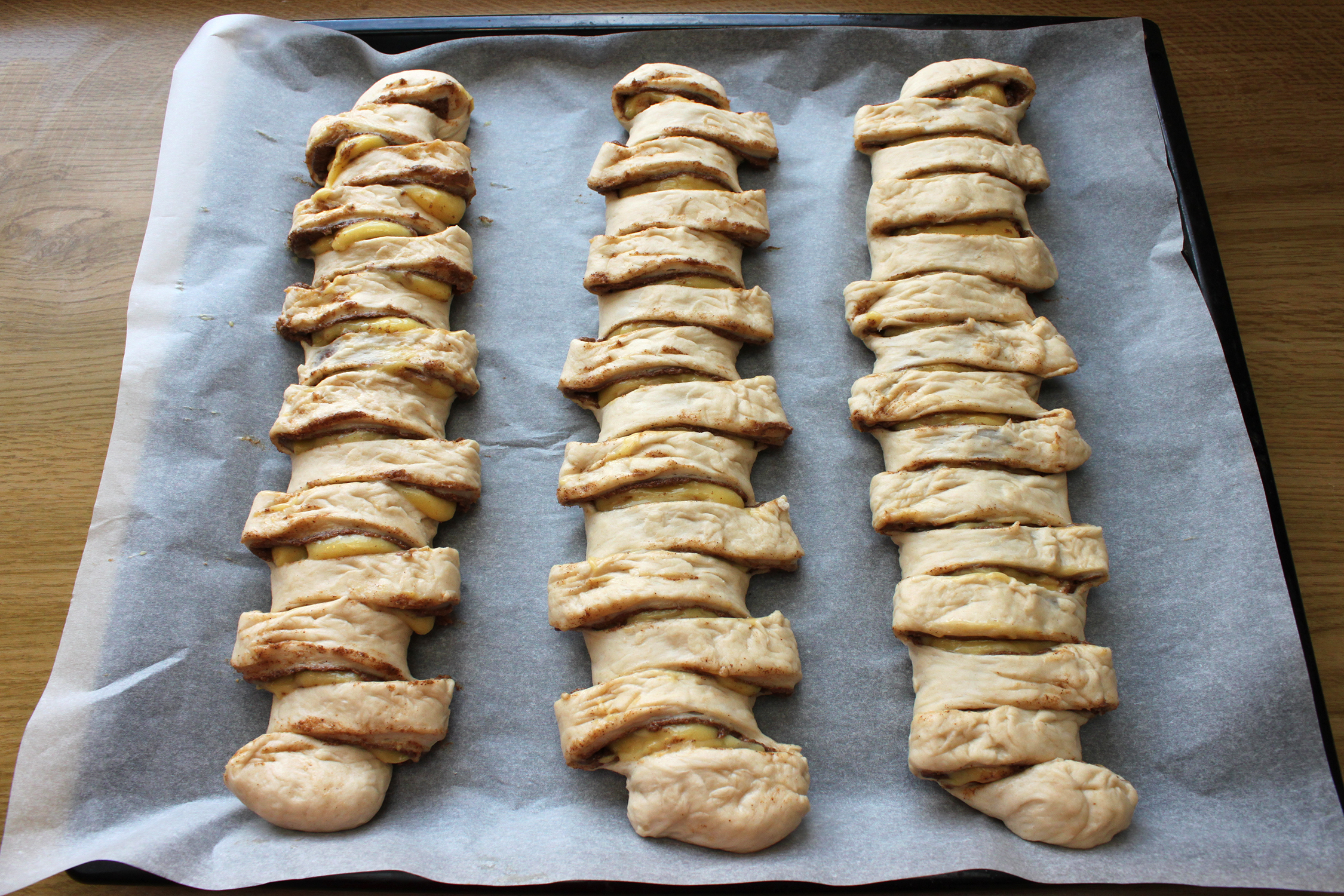 Efterfølgende rulles dejen sammen på langs og lægges på bagepladen med samlingen nedad. Hver stang skæres halvvejs igennem med 1,5 centimeters mellemrum, og skiverne bøjes skiftevis til hver side. Alternativt kan du lave lodrette klip med en ren saks og bøje dejen skiftevis til hver side. Klip ikke for dybt, da fyldet så risikerer at flyde for meget ud.