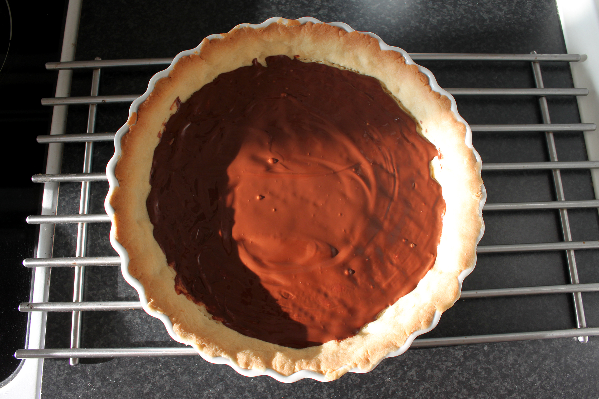 Smelt chokoladen i vandbad. Dette gør du du ved at hælde vand i bunden af en gryde og stille en skål i gryden (ikke en plasticskål). Put chokoladestykker i skålen og lad vandet småkoge. Rør i chokoladen jævnligt, indtil den er smeltet. Smør chokoladen på den færdigbagte tærtebund, og stil tærten på køl.