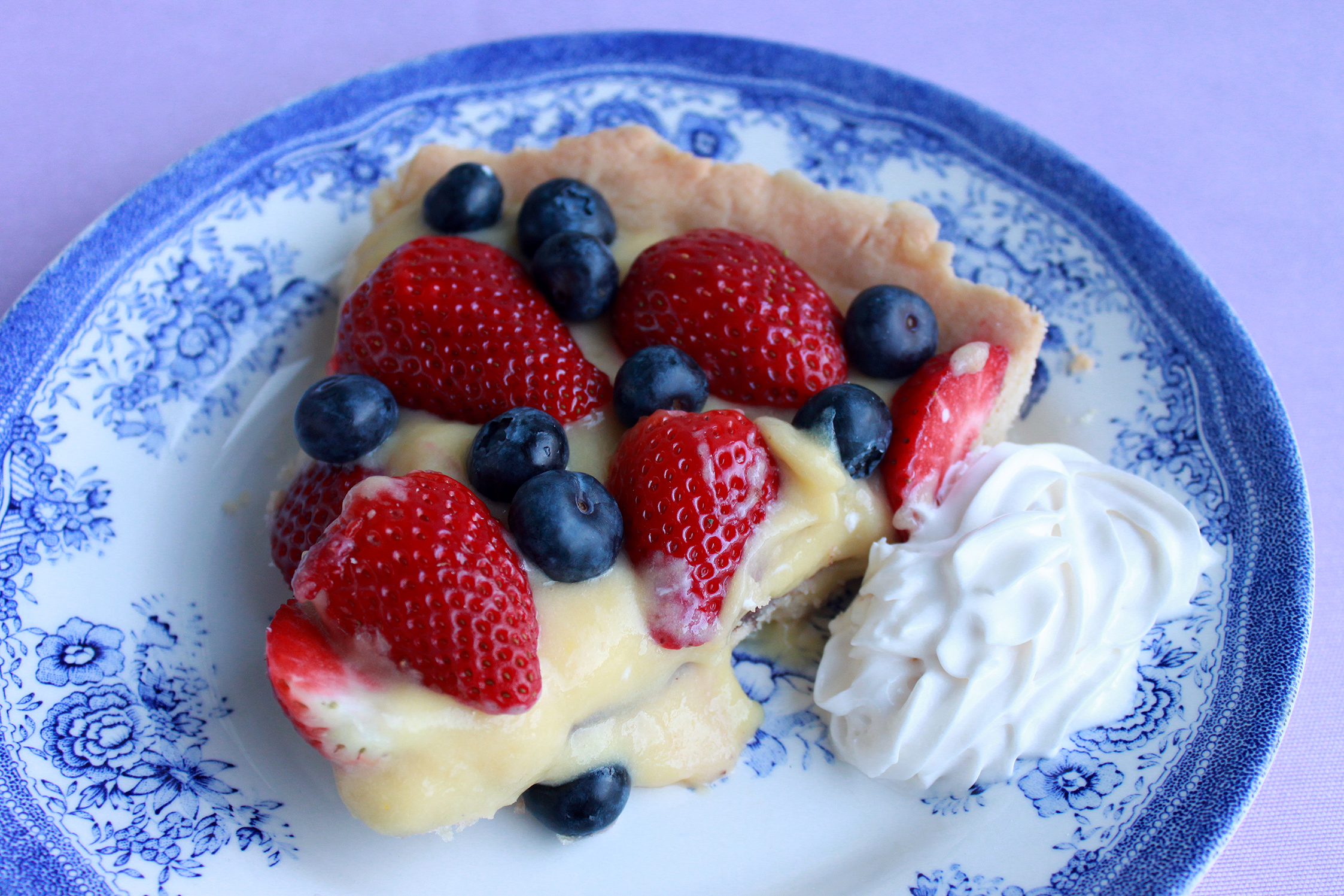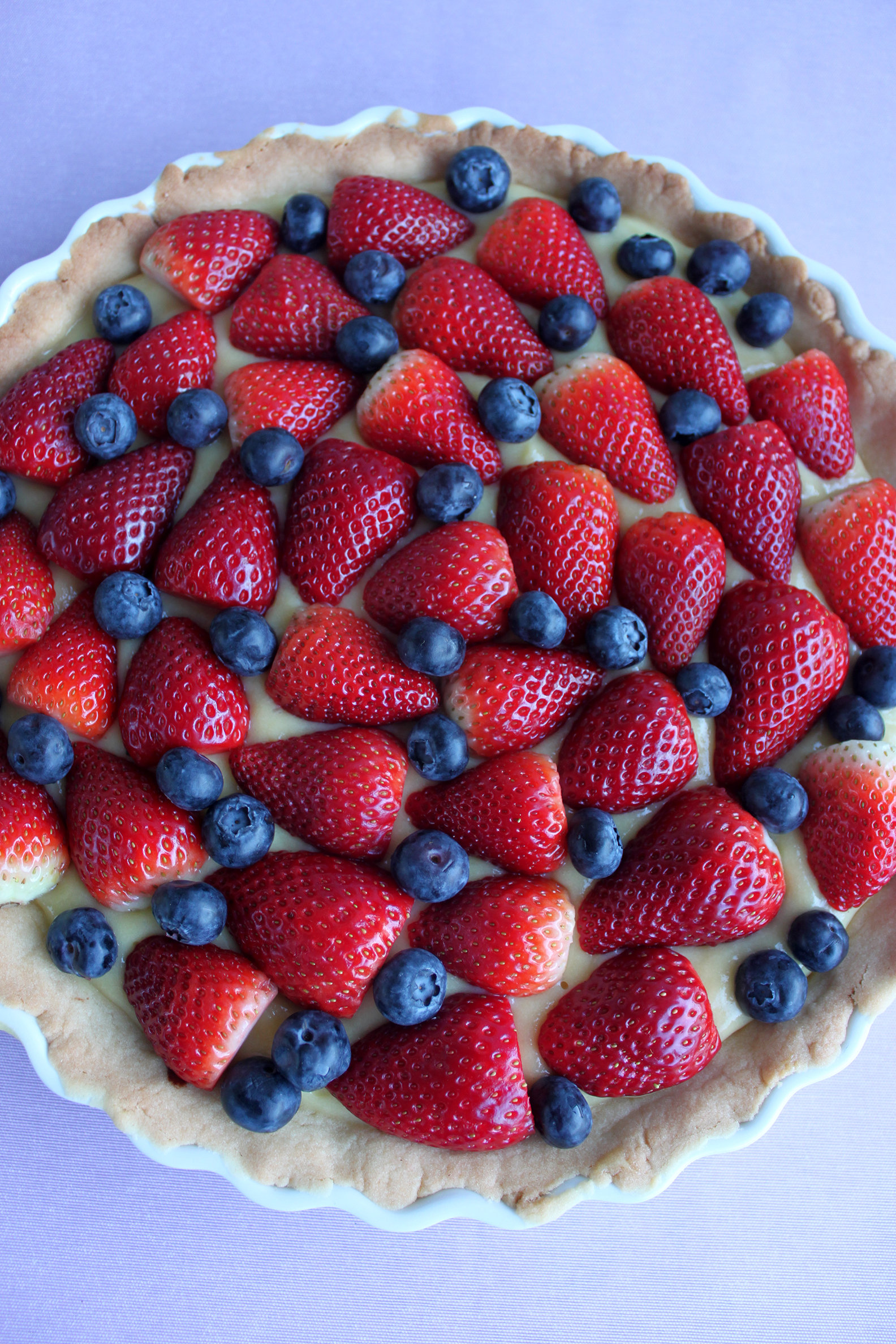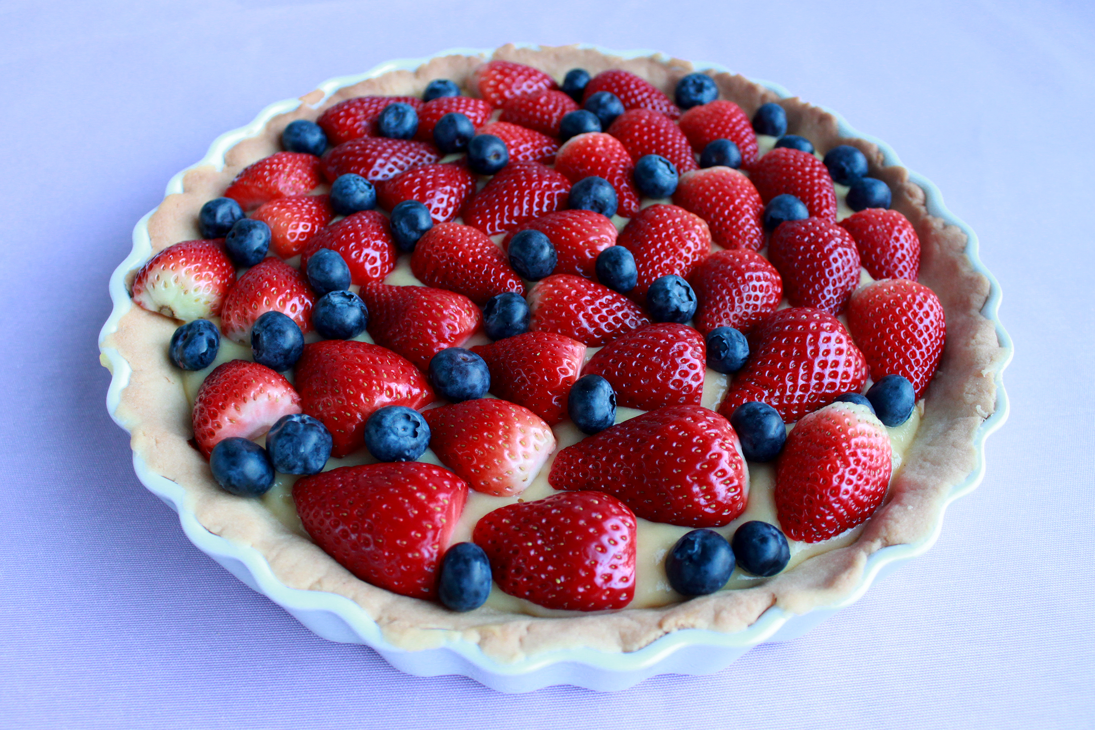Pisk kagecremen igen og smør den på den afkølede tærtebund. Halvér jordbærene og læg dem ovenpå kagecremen. Put blåbær imellem jordbærene.