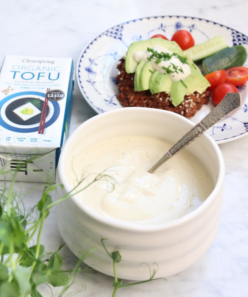 Ingredienser: 300 g silken tofu* 1½ spsk. hvidvinseddike 1 tsk. sennep 1 tsk. sort salt fra Himalaya (kala namak) 1 tsk. sukker