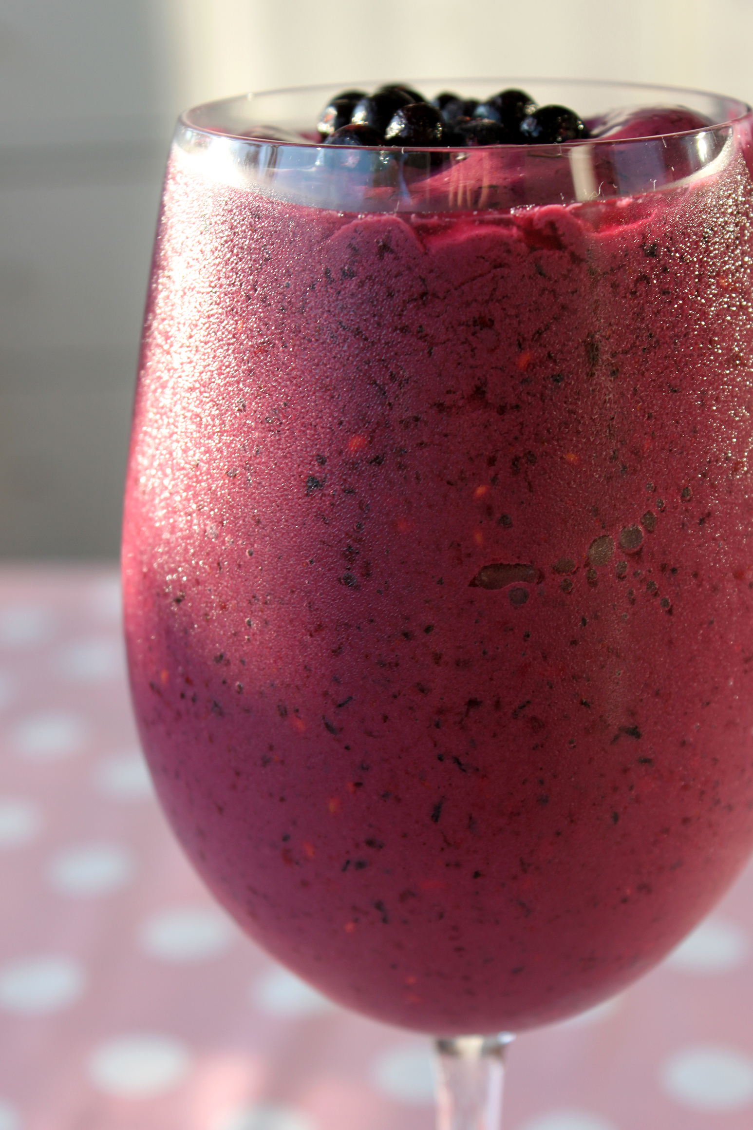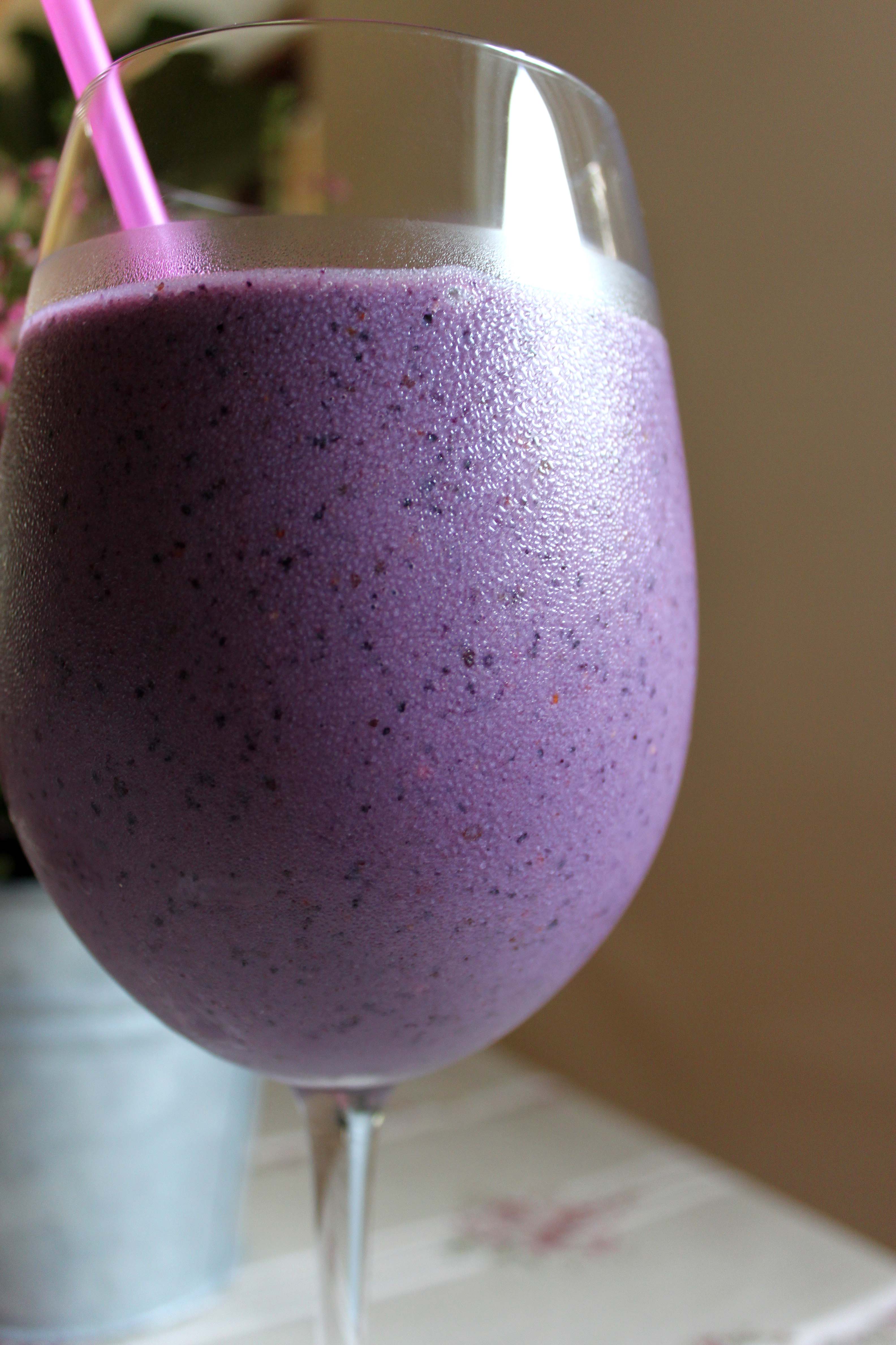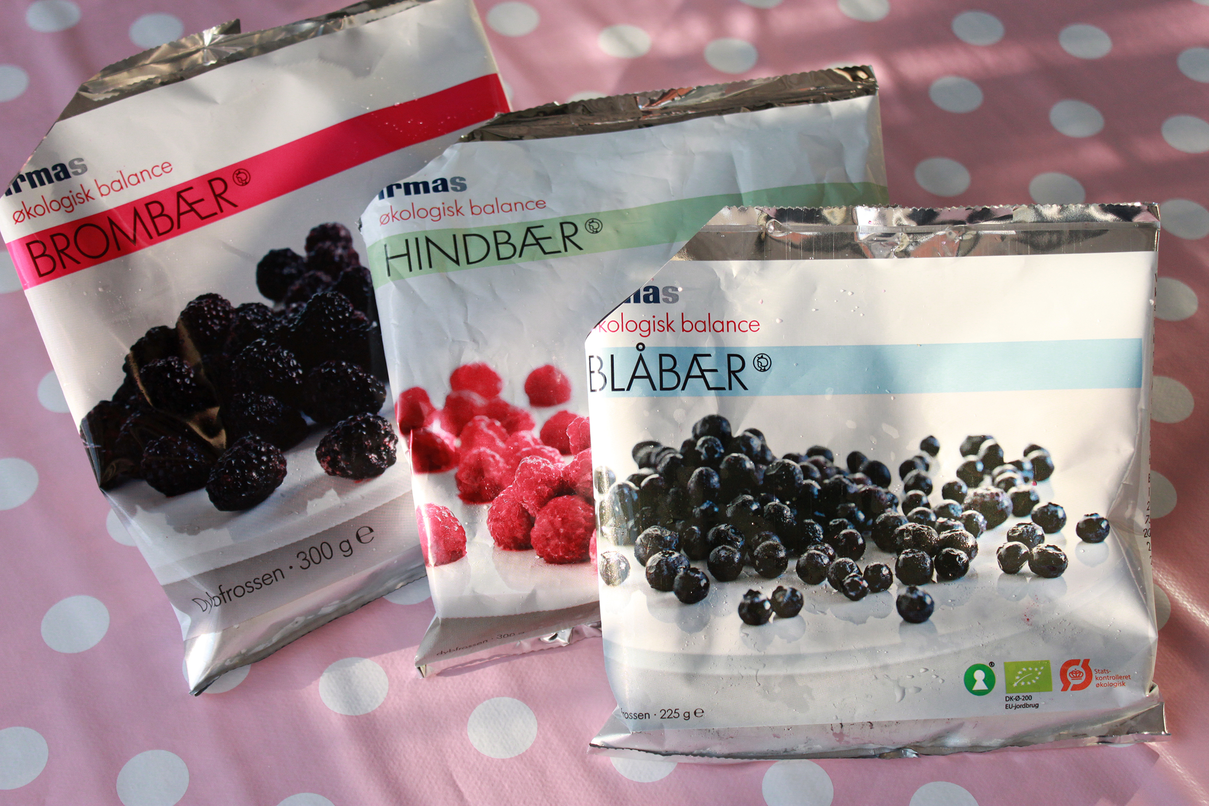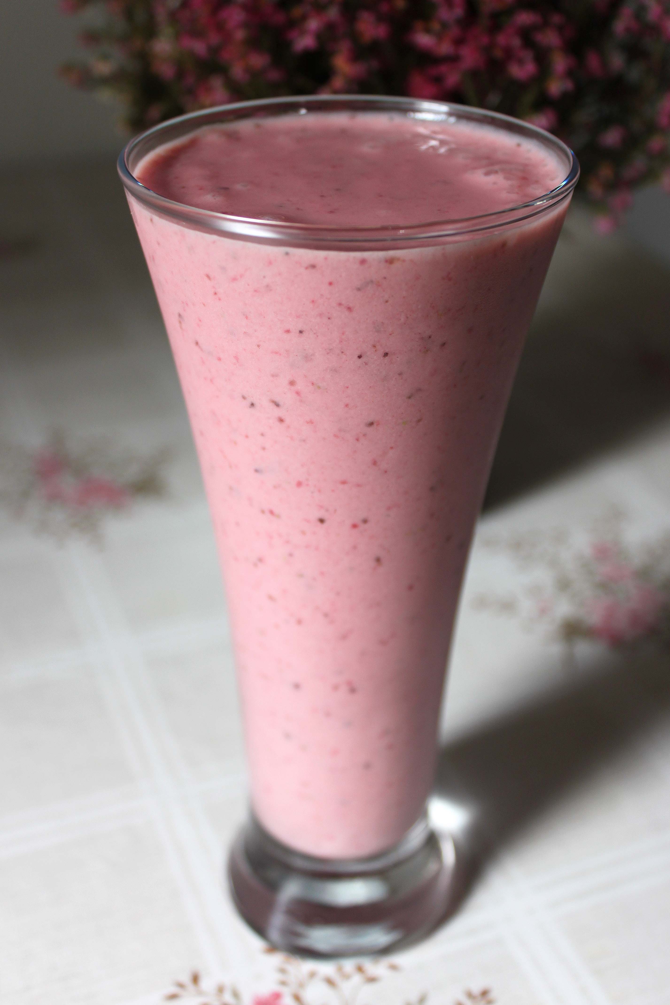 Denne milkshake fandt min kæreste på forleden dag, og jeg synes, at den er så god, at den fortjener en plads på min blog. Normalt laver jeg altid milkshakes med banan og frosne bær, men jeg synes ikke, at bananen mangler i denne milkshake. Den bliver rimelig tyk i konsistensen, men hvis man vil have den mere flydende, kan man tilsætte mere sojamælk eller færre bær.