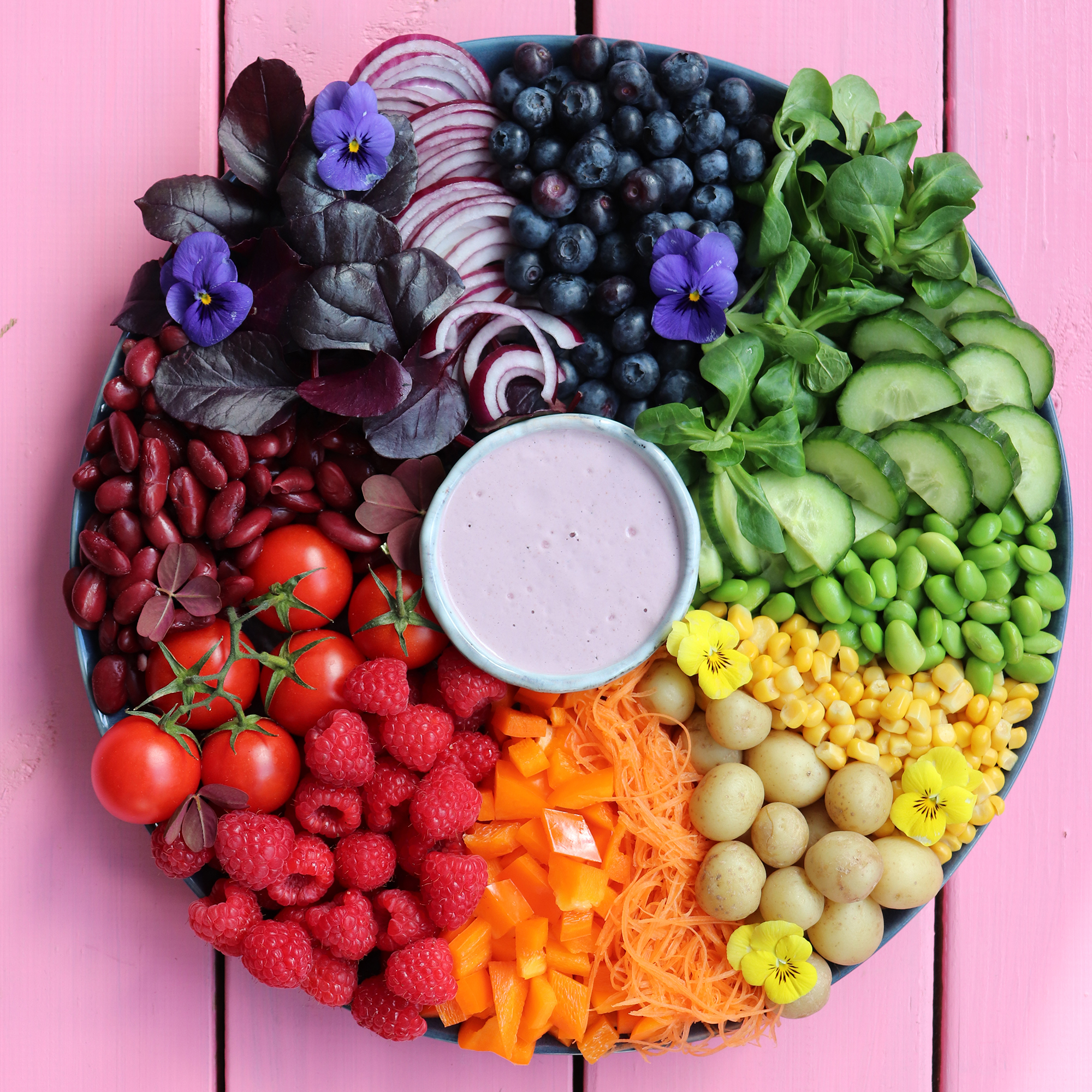 Skær grøntsagerne ud. Læg ris i bunden af en skål og anret grøntsager, tofu, tang med mere ovenpå.