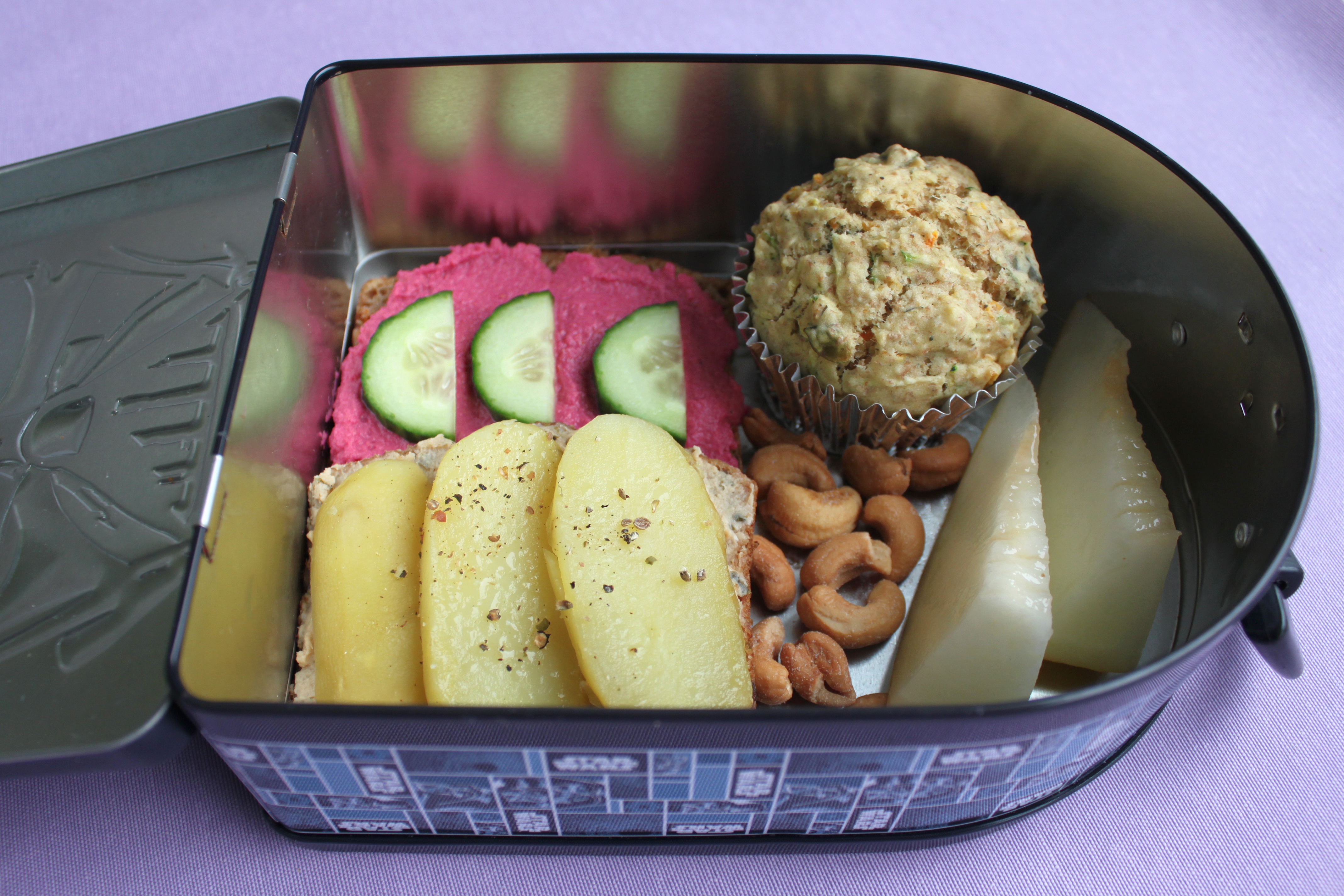 – To rugbrødsmadder i hver madkasse med henholdsvis plantesmør, rødbedespread, ærtehummus samt peberfrugt og agurk