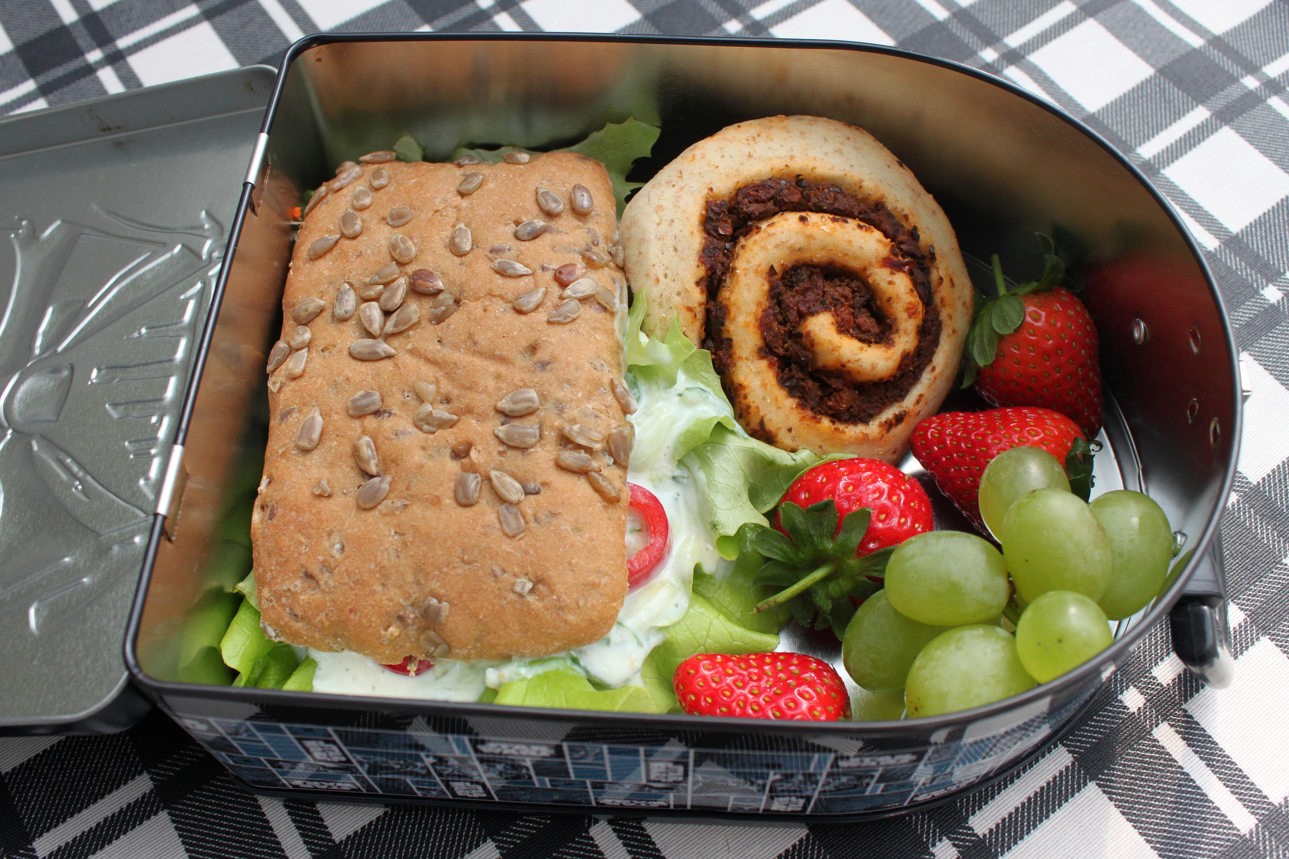 De følgende eksempler på madpakker er ment som inspiration. Det er ikke hver dag, at jeg selv har tid eller overskud til at gøre så meget ud af madpakkerne. Men man sparer tid, hvis man laver pålæg (hummus, bønnepostej osv.) og fryser det ned i mindre portioner i stedet for at lave det hver uge. Der er efterhånden også kommet mere vegansk pålæg i butikkerne, hvis man ikke har lyst til at lave det hele selv. F.eks. har Aldi et pænt udvalg af smørepålæg og pålægspølse. Ekstra ting som f.eks. urtefrikadeller, madmuffins, pizzasnegle, pølsehorn, pirogger og boller kan også fryses og tages op efter behov. Bare tag det op af fryseren aftenen i forvejen og lad det tø op i køleskabet. Rester fra aftensmaden kan også med fordel bruges i madpakken, hvis det skal være noget andet end rugbrød.