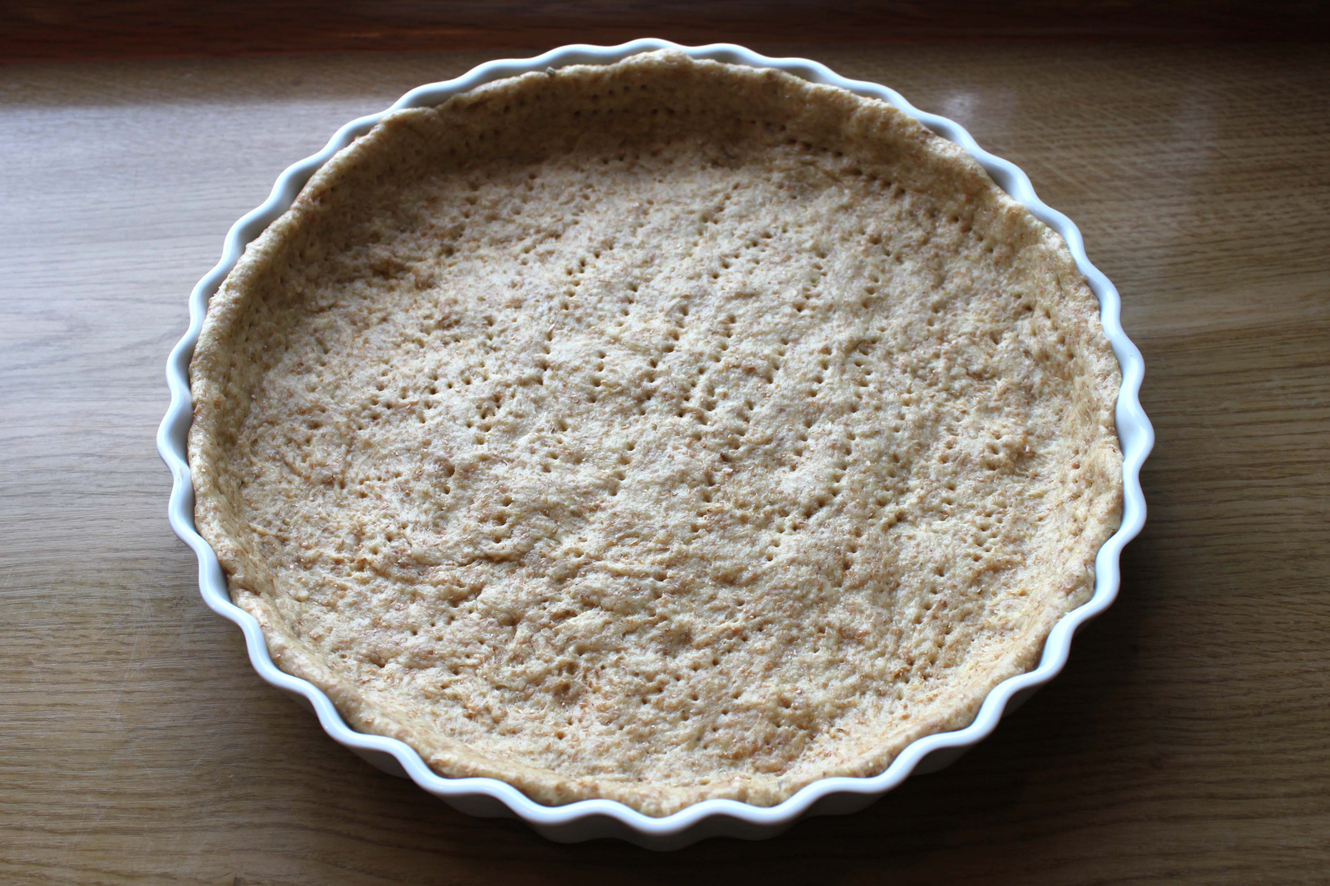 Tænd ovnen på 200 grader og lav dejen, mens ovnen varmer op. Hvedemel, grahamsmel og salt blandes. Olien røres i og til sidst tilsættes vandet. Ælt dejen godt og put den i en stor tærteform (28 cm i diameter). Dejen trykkes jævnt ud i formen med fingrene og op af siderne. Dejen prikkes med en gaffel og forbages i 15 minutter (se billede nr. 1).