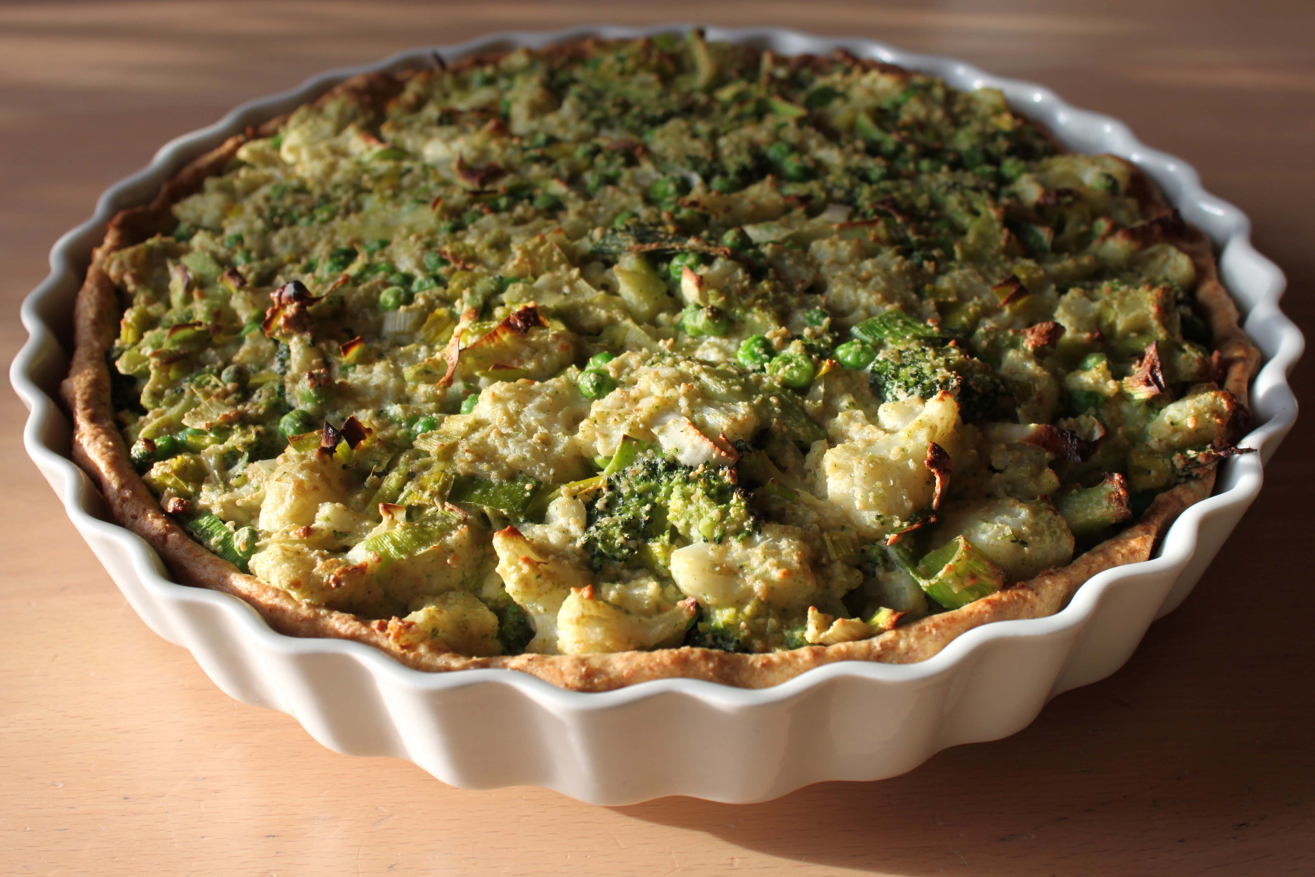 Det er ret nyt for mig at lave grøntsagstærte, men efter jeg fik en god tærteform i julegave, er det min plan at lave det jævnligt. Grøntsagstærte er nemlig rigtig lækkert og kan varieres med mange forskellige slags fyld. Denne her med blomkål, broccoli, ærter og porrer lavede jeg i dag til frokost, og den blev meget vellykket! Sovsen, der bl.a. bestod af cashewnødder og sojamælk, fungerede rigtig godt, for den blev ret fast, da den blev bagt i ovnen. Det er måske lidt omstændigt at lave både fyld, sovs og dej, men det er slet ikke svært, og det kan være ganske hyggeligt at lave, især hvis man er to.
