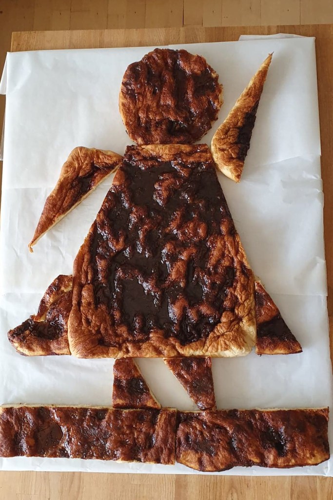 Jeg skar kroppen/kjolen og armene ud af den ene brunsviger. Derefter skar jeg hoved, fødder og bund/græs ud af den anden brunsviger. Da jeg skar hovedet, brugte jeg en 20 cm springform som skabelon, og det samme gjorde jeg, da jeg udrullede marcipanen til hovedet.