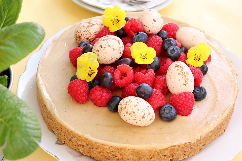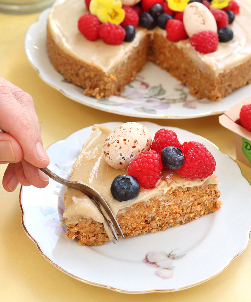 Intens og lækker gulerodskage med masser af smag og sunde ingredienser. Pynt den med bær og veganske marcipanæg for at skabe påskestemning.