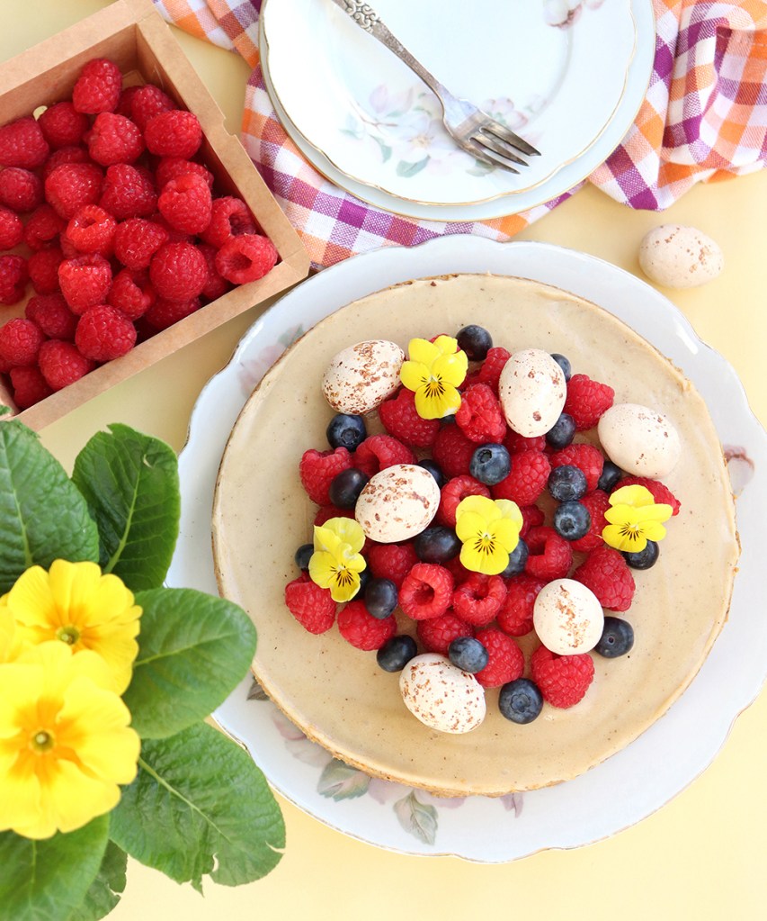 Nyd kagen, når den er blevet helt kold og mere fast i det. Sæt den evt. i fryseren, hvis det skal gå hurtigt. Pynt kagen med masser af friske bær og veganske marcipanæg for at skabe påskestemning.