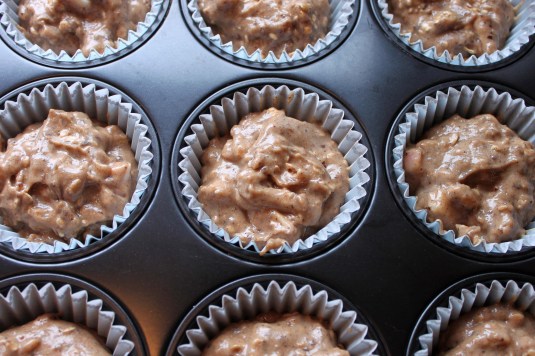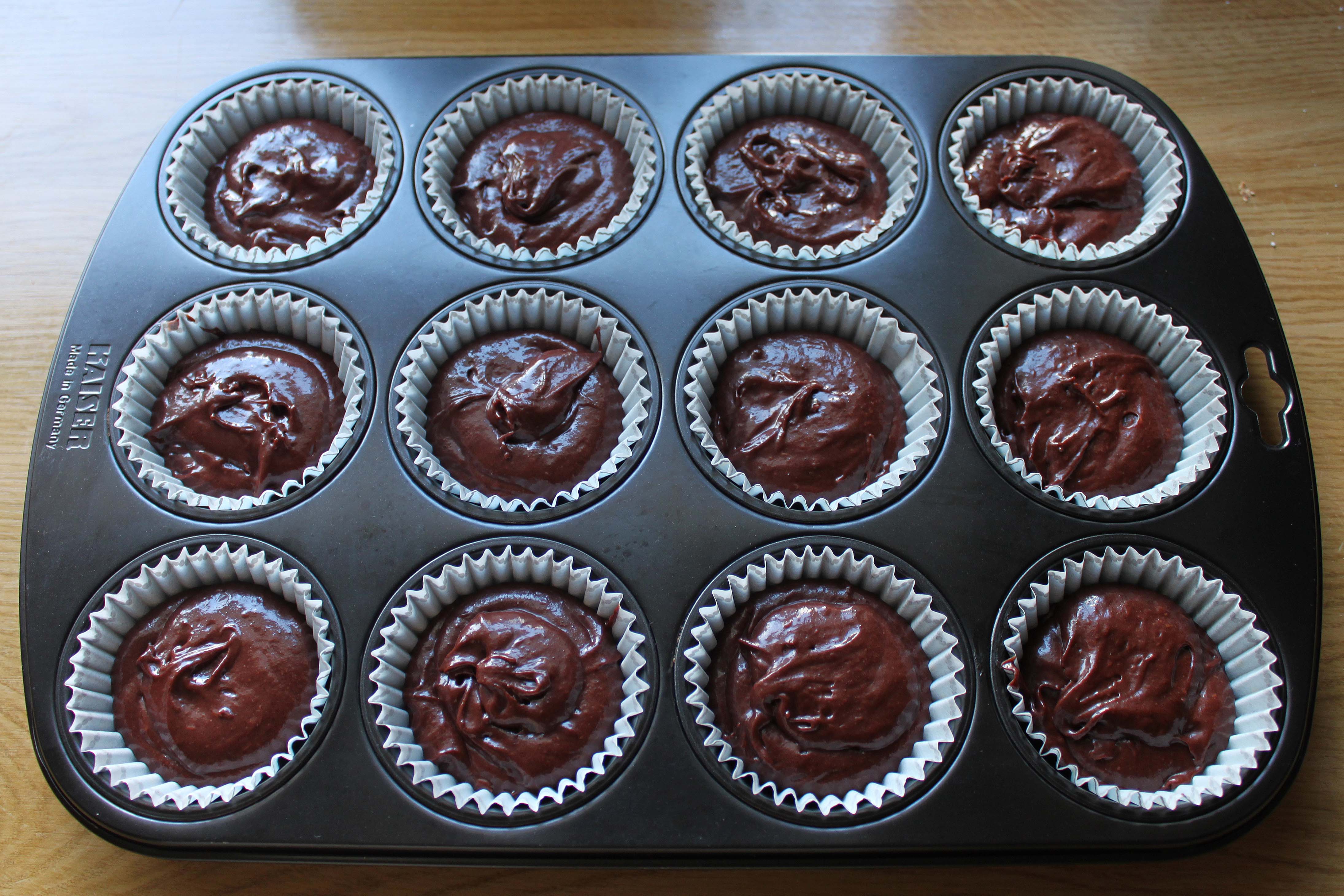 Bland dejen og fordel den i muffinforme. Jeg anbefaler at bruge en muffin-bageplade beklædt med forme af papir.