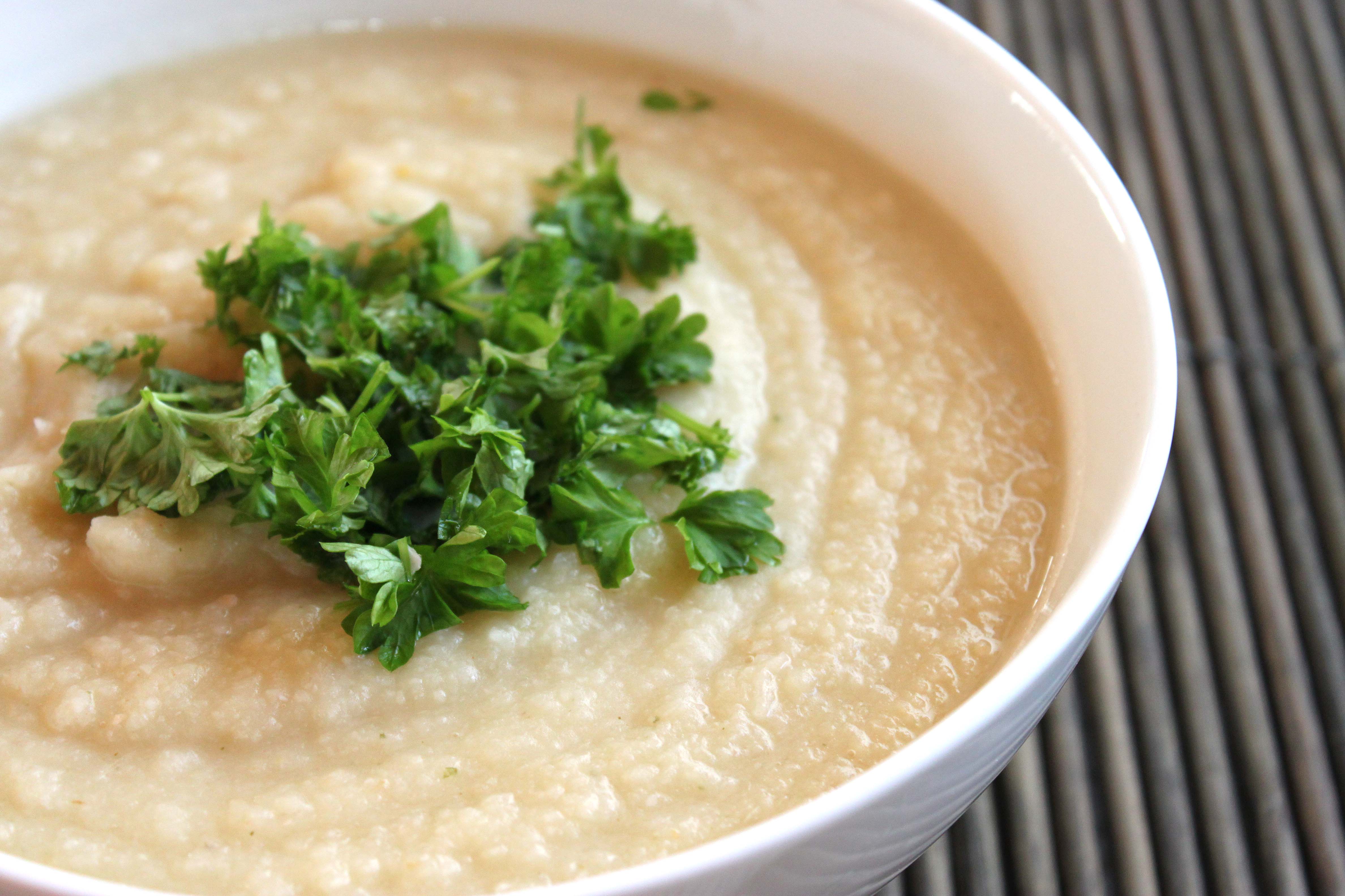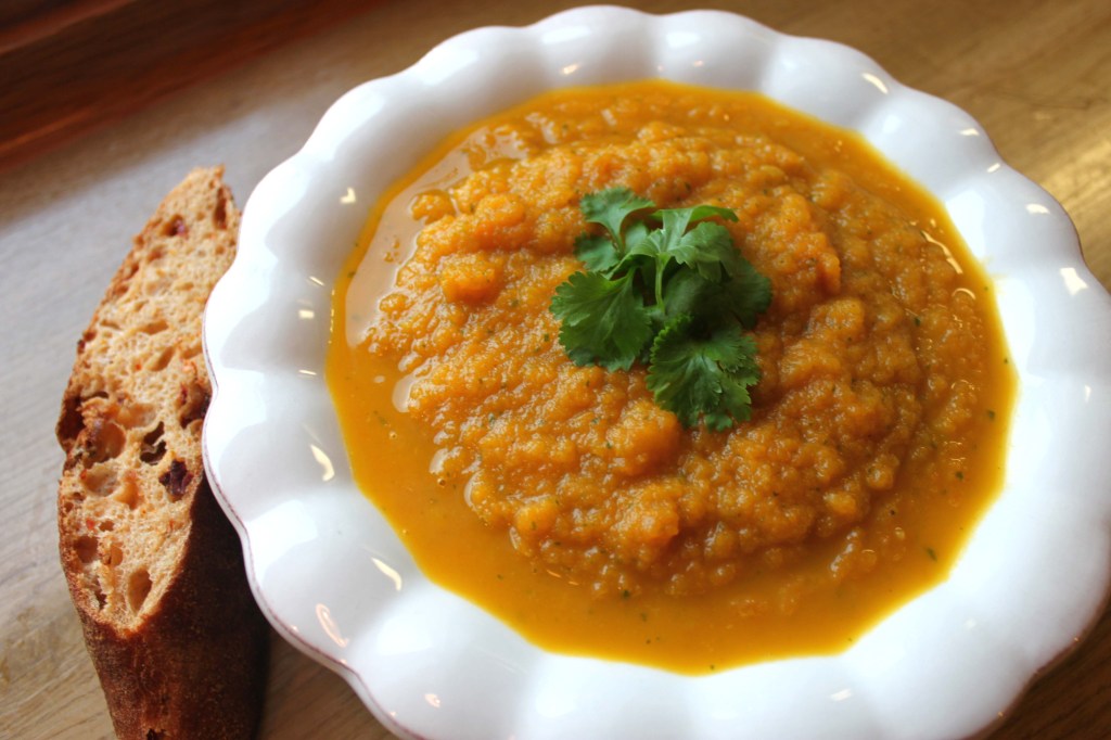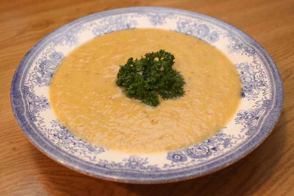 Server suppen med hakket frisk persille på toppen og groft brød.