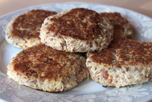 Rør alle ingredienserne sammen til en fars, og form den til frikadeller. Tryk frikadellerne godt sammen, når du former dem. Frikadellerne steges i olie på en pande på hver side, til de er gyldne.