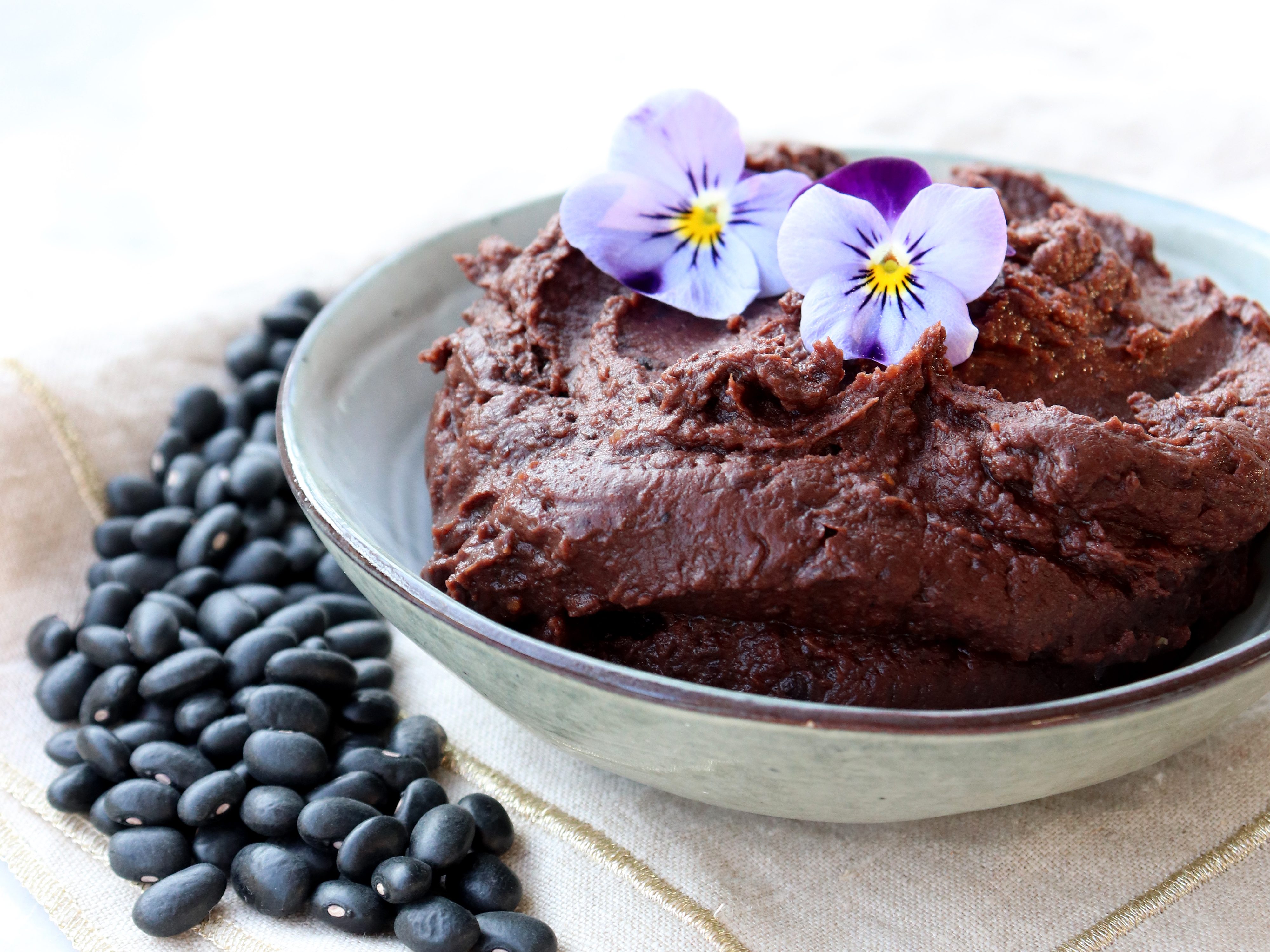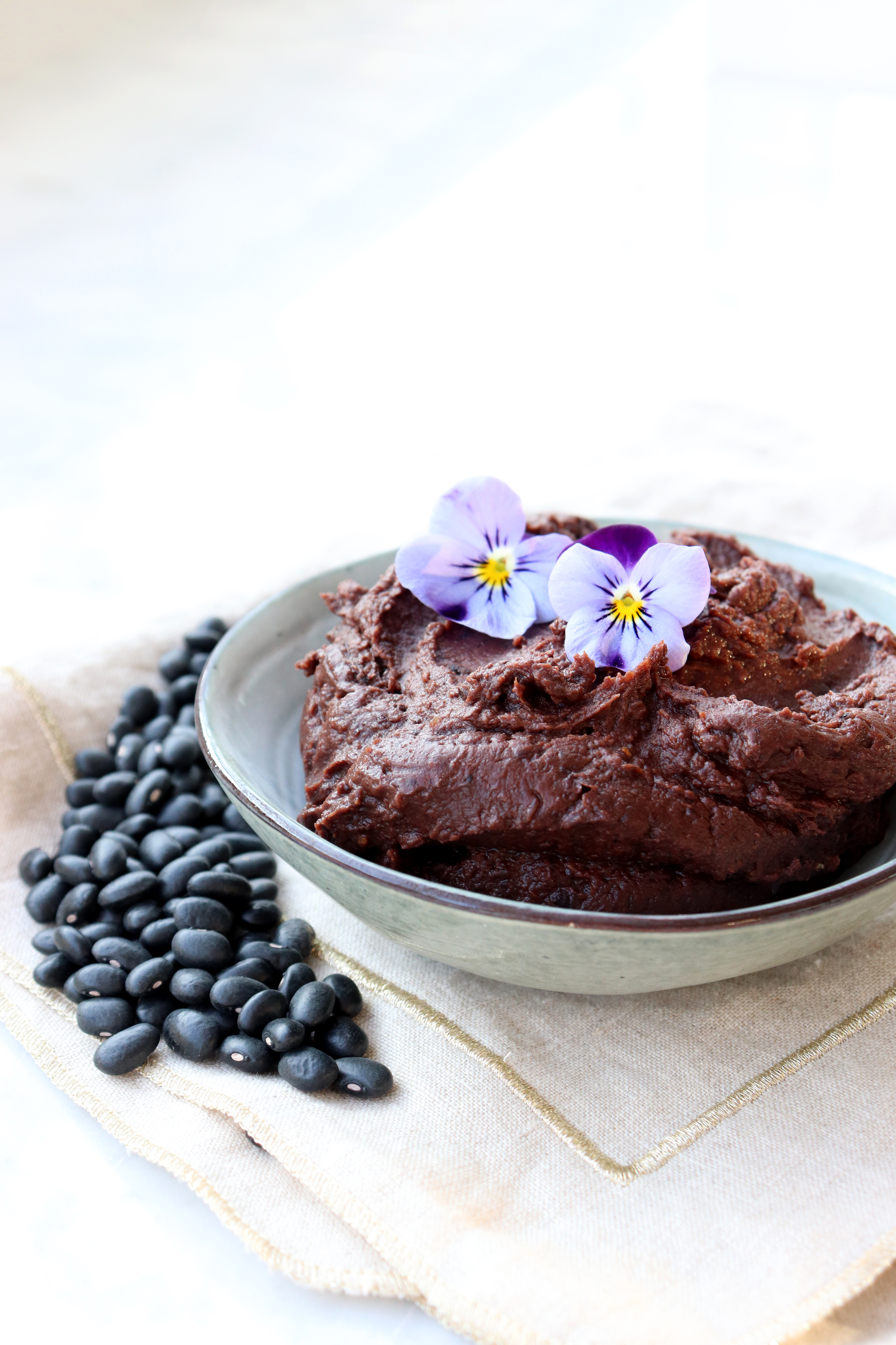 Dræn vandet fra de sorte bønner og hæld dem i en foodprocessor sammen med dadler, banan, peanutbutter, kakaopulver og vand. Blend til det er en ensartet masse, og hæld den derefter over i en skål.
