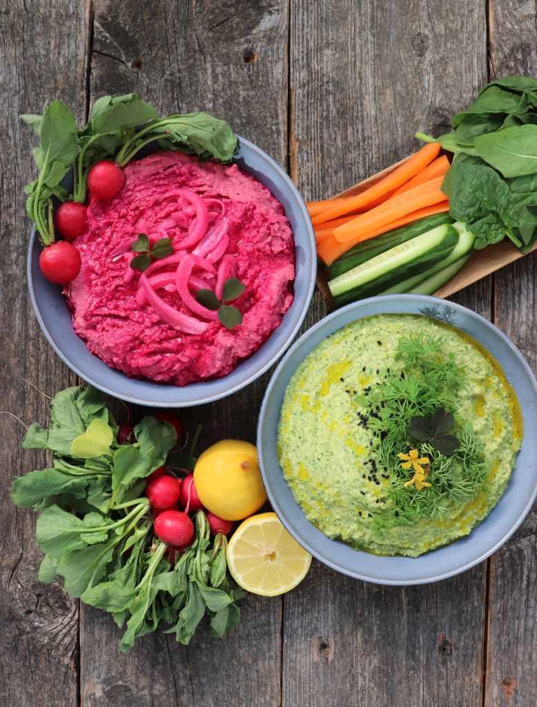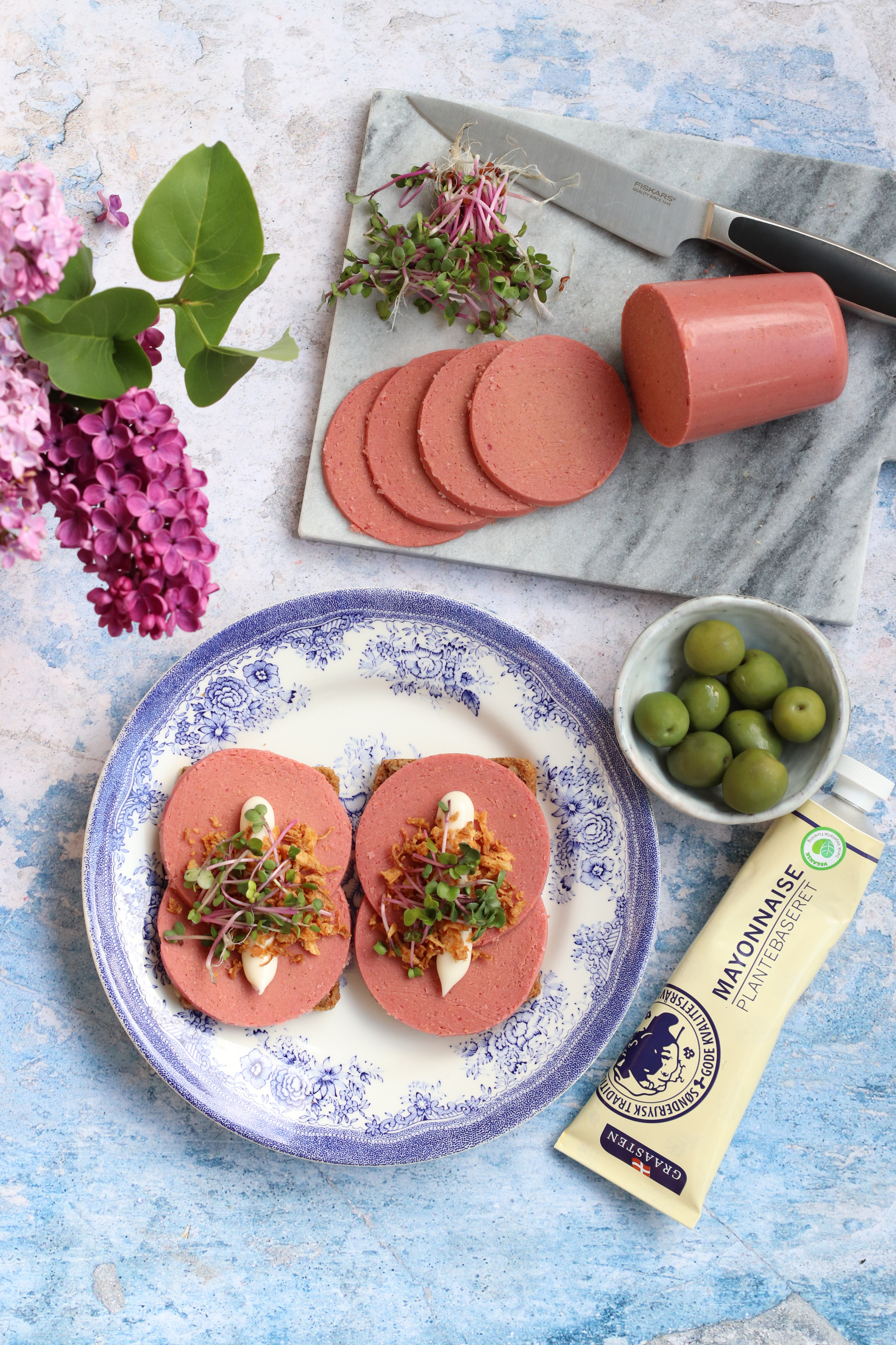 Æggefri salat, tofu-postej, vegansk kødpølse, bønne/nøddepostej, rødbedehummus, ærtehummus og leve-postej.