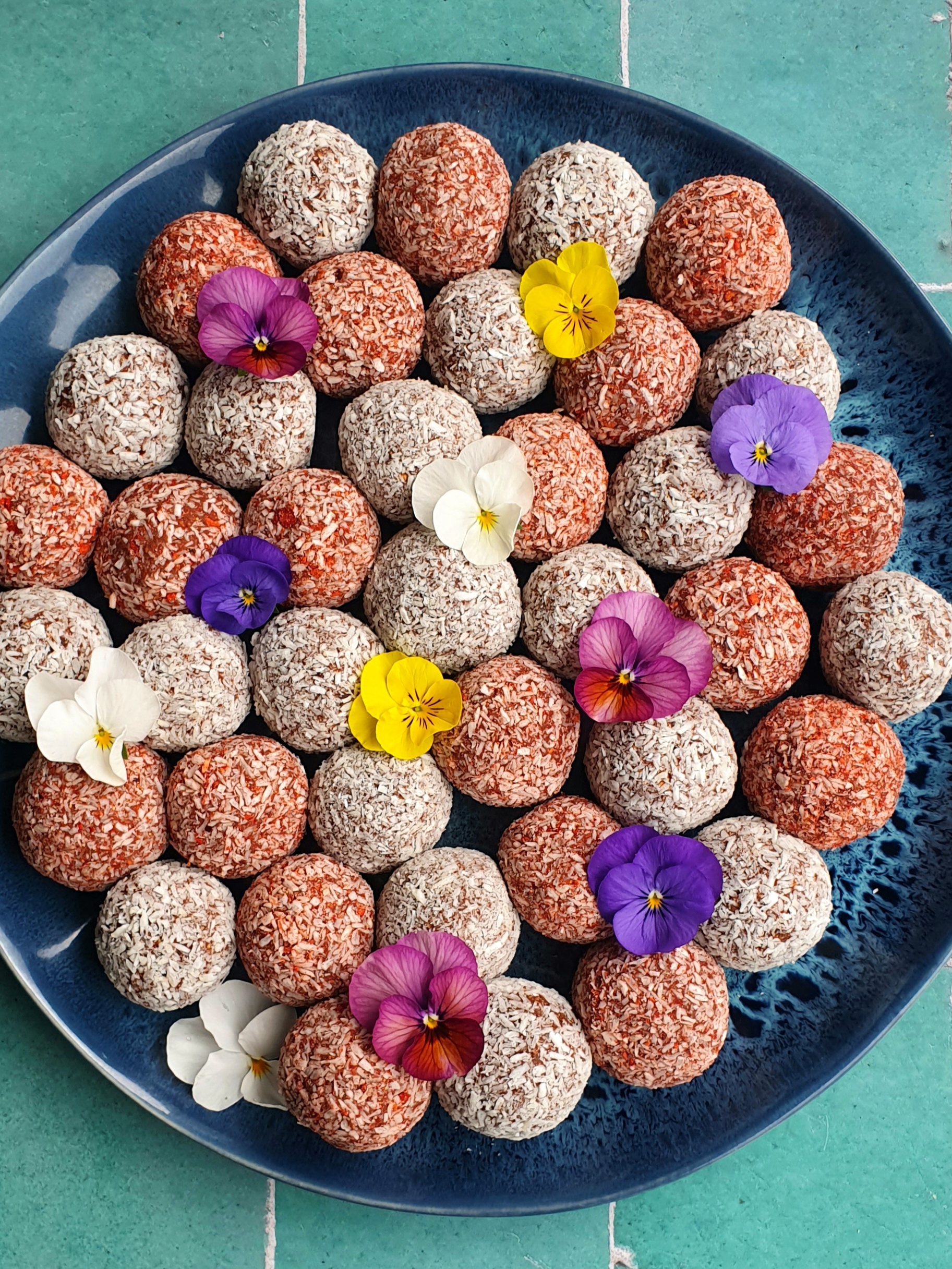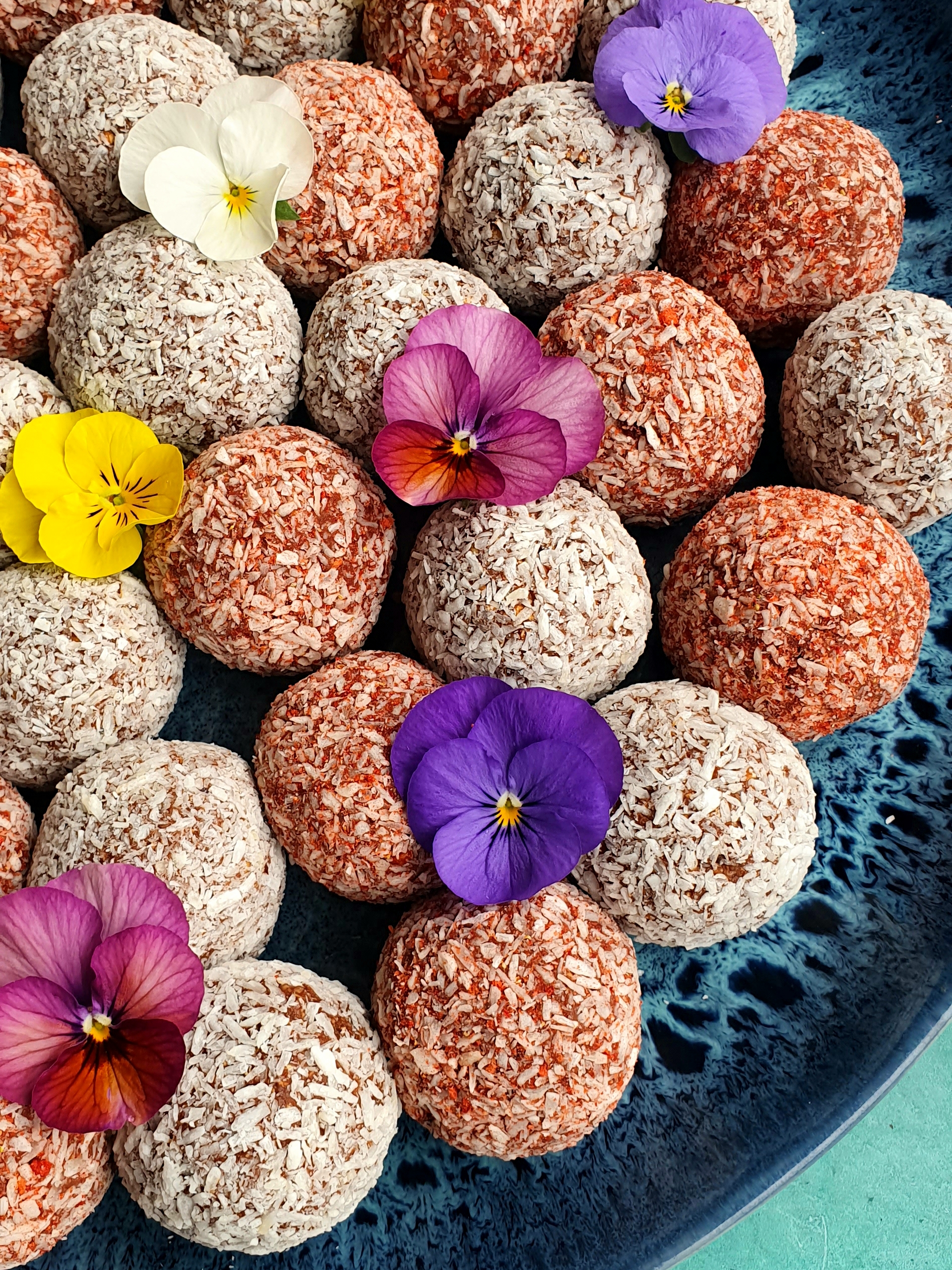 👉Tril massen til kugler og rul dem i kokosmel. Bland evt. kokosmelet med frysetørret hindbær, der er blendet, for at lave en farvet variant.