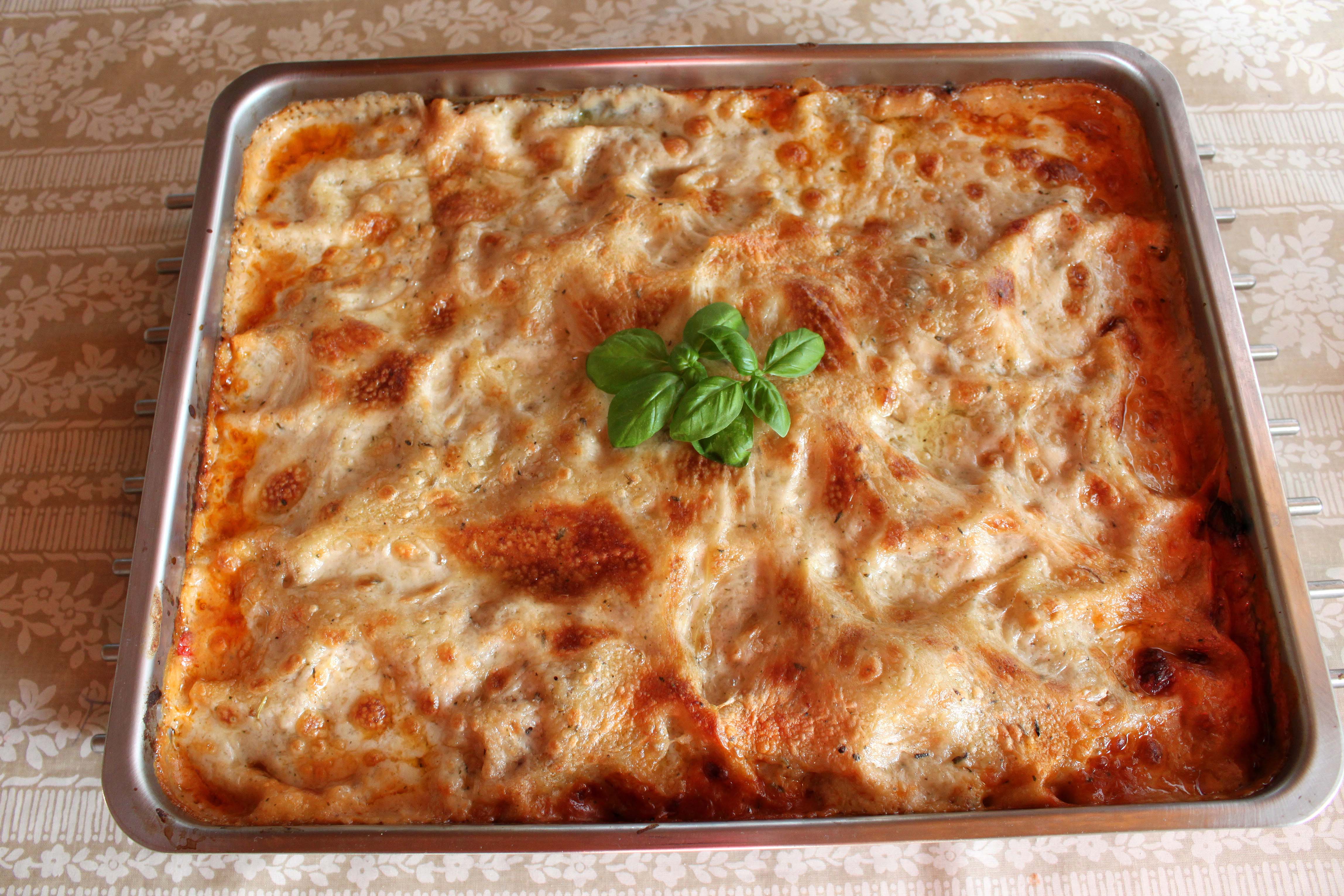 Lasagnen bages ved 200 grader i en halv time. Serveres eksempelvis sammen med ovnbagte kartofler og salat.