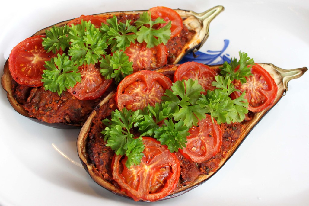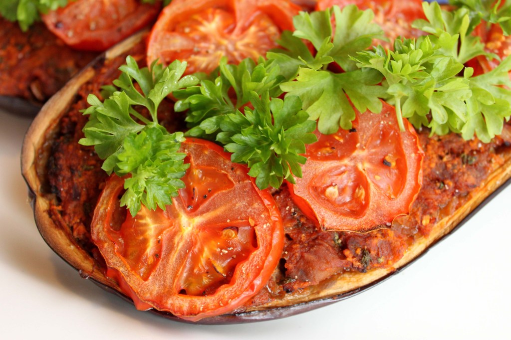 Alle kan lide fyldte grøntsager, om det så er fyldte peberfrugter, tomater, squash eller som i dette tilfælde auberginer. Fyldte grøntsager er perfekte som forret eller som hovedret med f.eks. en linsefrikadelle til – men de kan også spises alene, for de smager så godt, at man sagtens kan spise sig mæt i dem uden at mangle noget. Dette bliver helt sikkert ikke den sidste opskrift på fyldte grøntsager…